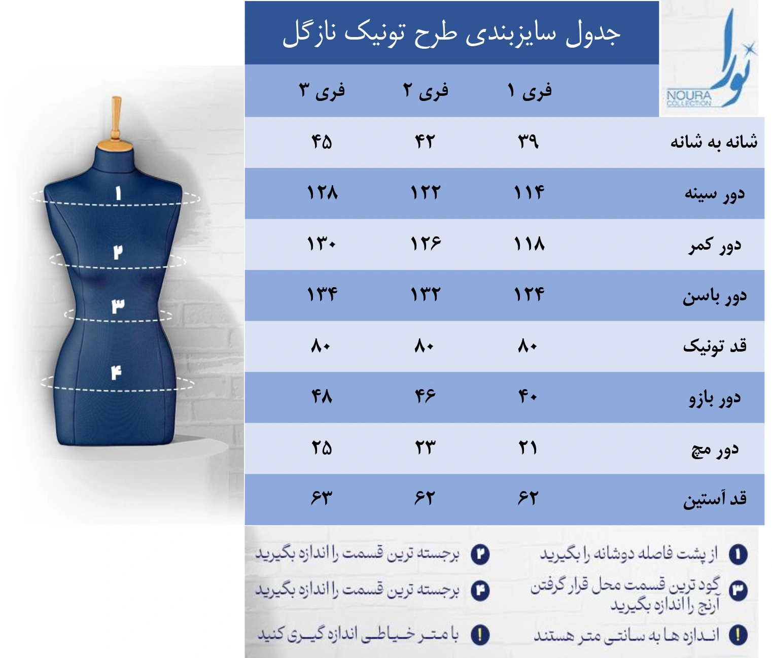 این محصول، در سه سایز فری، تولید شده است که به شرح ذیل می باشد: “به جدول سایزبندی، دقت فرمایید.”